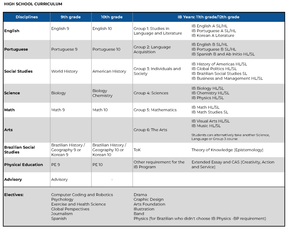 Brazilian students are also required to complete the Brazilian diploma work, particularly if they have only one nationality. Completion of the graduation requirements for the U.S. diploma will also complete practically all of the course requirements for the Brazilian diploma and the IB diploma.
